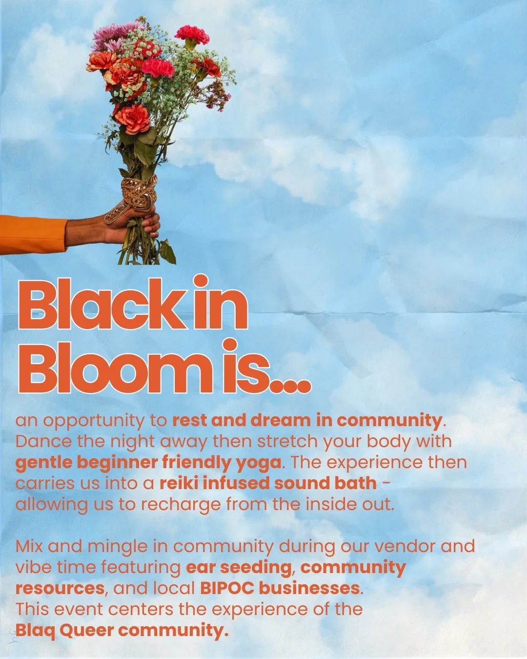 Black in Bloom is an opportunity to rest and dream in community. Dance the night away, and then stretch your body with gentle beginner friendly yoga. The experience then carries us into a reiki-infused sound bath - allowing us to recharge from the inside out. Mix and mingle in community during our vendor and vibe time, featuring free earseeding, workshops, community resources, and local queer BIPOC businesses.